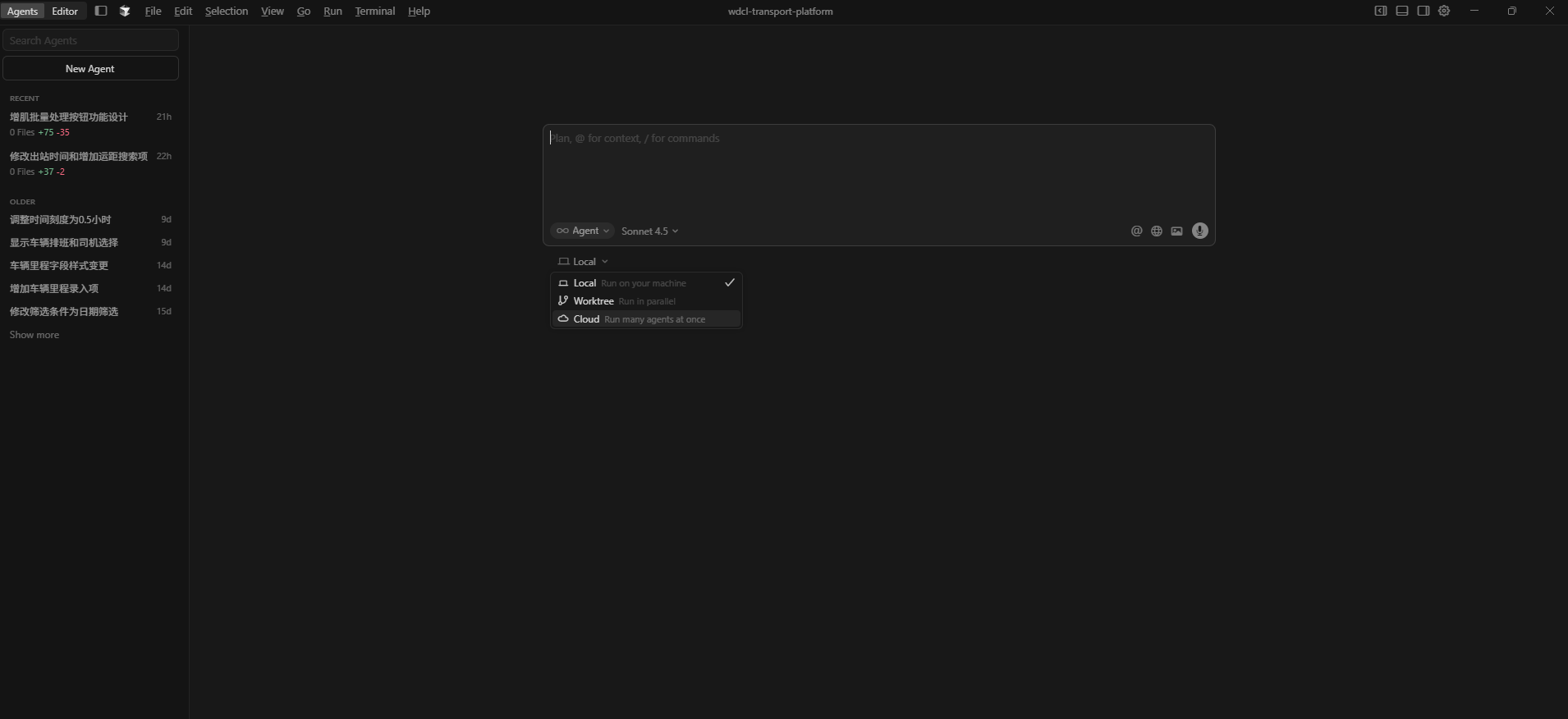 默认是专门的 agent 页面.一个大大的对话框.
