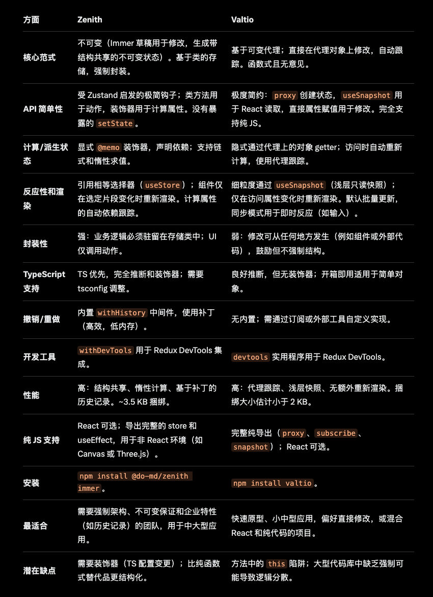 jaydenWang OP @XCFOX Zenith 和 Valtio 确是很相近,下面是整理的对比,Zenith 在封装和工程化上会有一些优势,使用确实没 Valtio 简单